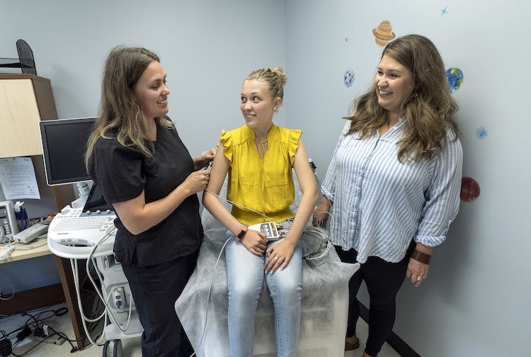 디 조이스는 자신의 딸 라일리가 1년 넘게 오랫동안 지속되는 코로나19 증상을 겪고 있다고 말했습니다. Rylee는 현재 버지니아주 전역에서 RECOVER 프로젝트에 등록한 200명 이상의 어린이, 청소년 및 청년 중 한 명입니다. 사진 왼쪽에서 오른쪽으로: Laura Stevens, RN, 임상 연구 간호사 코디네이터, Rylee Joyce 및 Dee Joyce. (카지노사이트 엔터프라이즈 마케팅 및 커뮤니케이션)