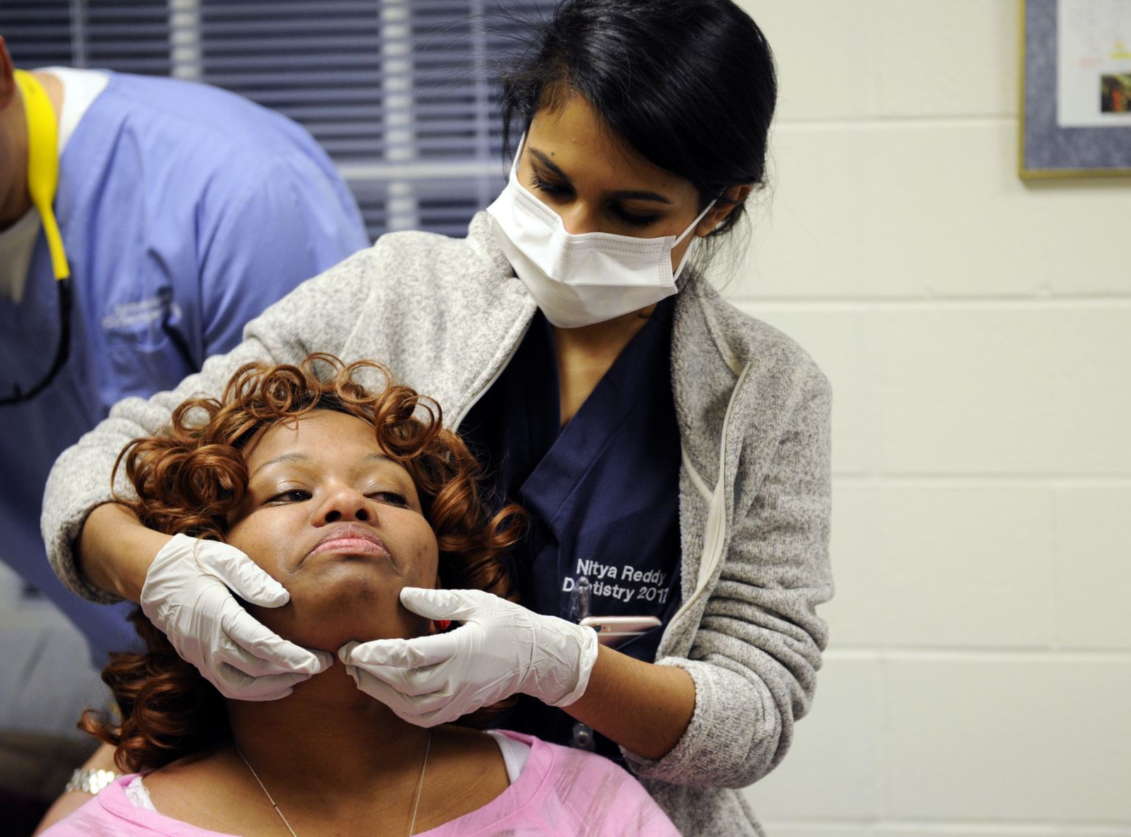 최근 노숙자 보호소에서 열린 건강검진에서수요일3월 저녁, 버지니아 커먼웰스 대학교 의대생이 도리스 앤 파웰의 혈압을 124/83 mmHG로 측정합니다.