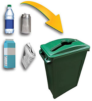 다음 품목은 녹색 재활용 용기에 넣을 수 있습니다: