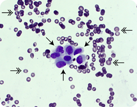 이 이미지는 겨드랑이 림프절로 전이된 유방암을 묘사합니다. 이상해 보이는 겨드랑이(겨드랑이) 림프절을 미세한 바늘로 흡인하여 만든 도말입니다. 배경에는 많은 적혈구(이중 화살표)가 있습니다. 이 이미지의 중앙에는 암세포 그룹(단일 화살표)이 있습니다.